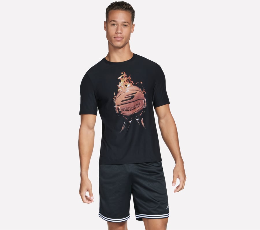 Comfort unlocks peak performance and athletic style with Skechers Basketball®: B-Ball Tee. Made from 100% breathable cotton, this tee features a front blazing basketball graphic.