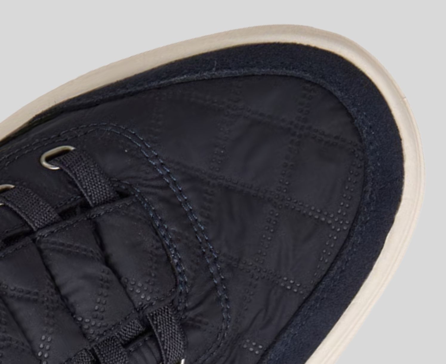 - Air-quilted nylon, duraleather, and suede overlay upper