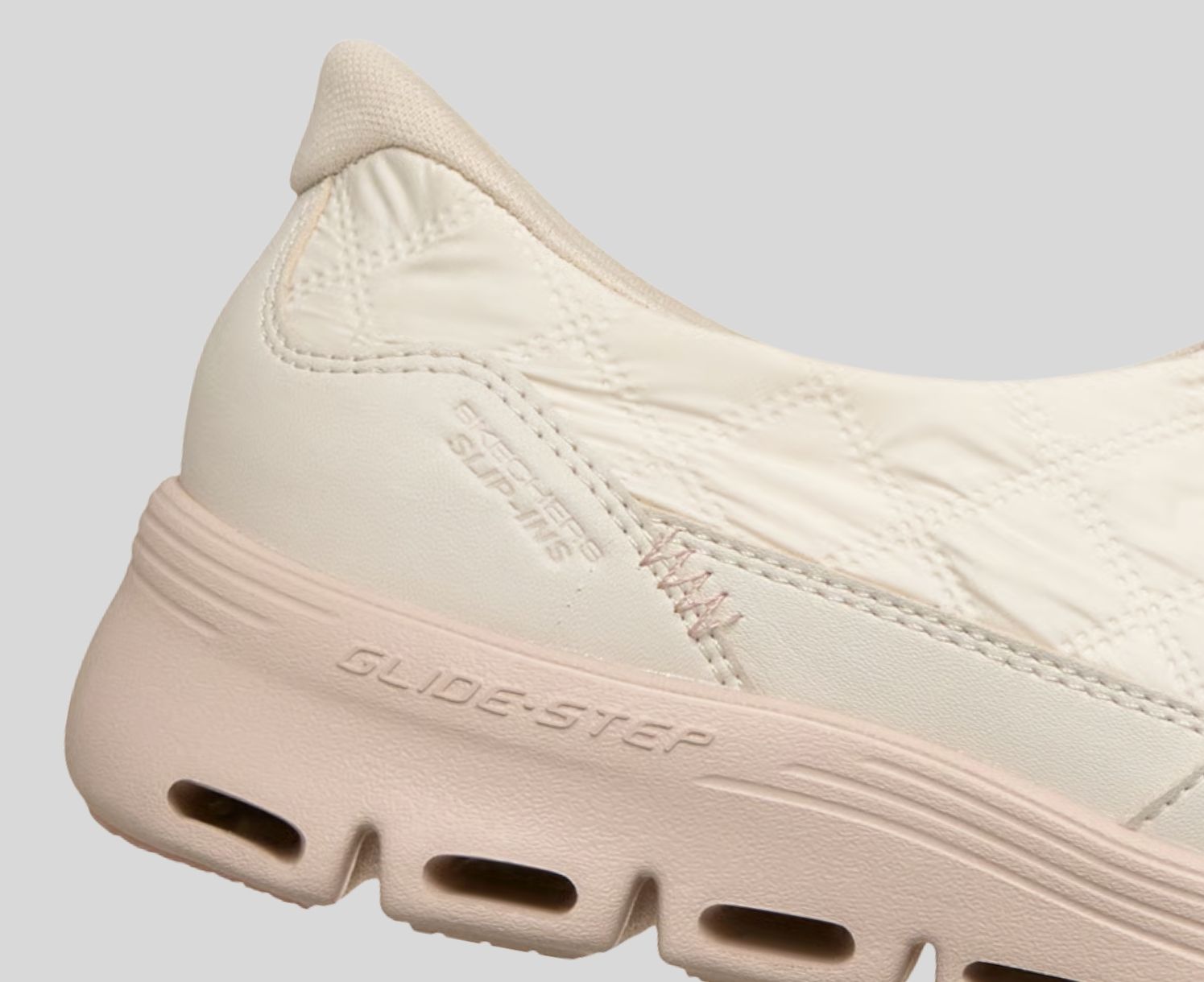 Step into effortless style and comfort with Skechers Hands Free Slip-ins®: Glide-Step® Serene - Cozy Fit® Newport. Designed with our Heel Pillow®, this vegan slip-on features an air-quilted Cozy Fit® and synthetic upper with tied-off stretch laces, a high-rebound Skechers Air-Cooled Goga Mat™ insole, and our geometric Glide-Step® midsole combined with responsive ULTRA GO® cushioning.