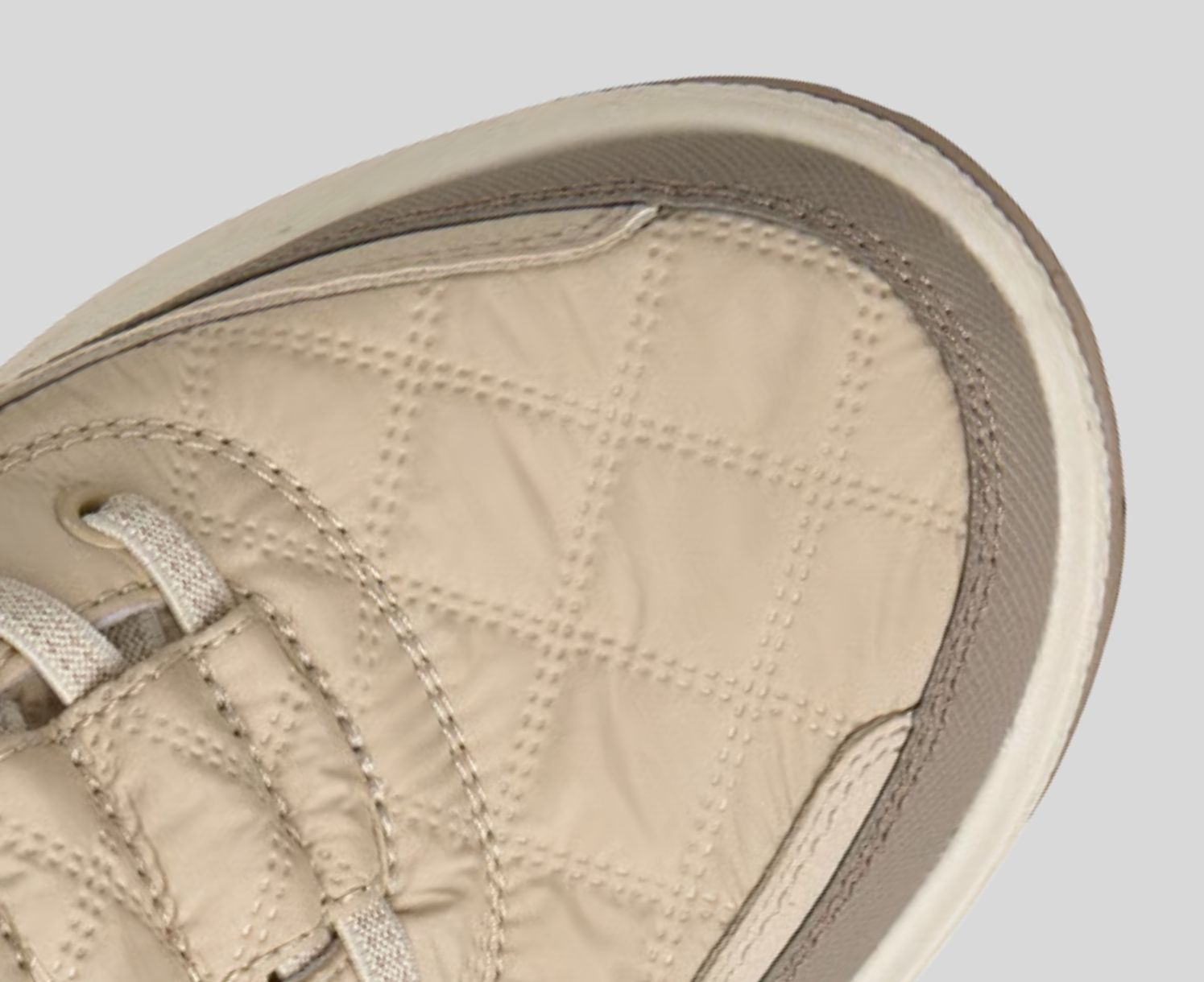 • Quilted fabric, synthetic, and leather upper with tied-off stretch laces