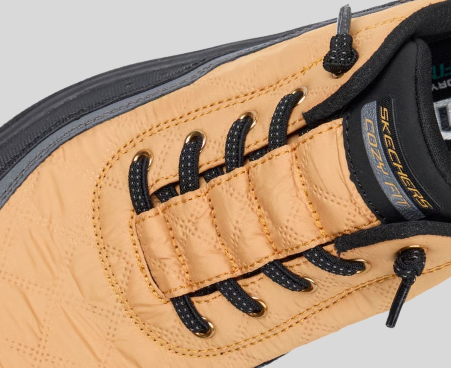 PUFFER FIT™ Treat your feet to effortless comfort wearing Skechers Hands Free Slip-ins[registered Relaxed Fit®: Urban Explore - Cozy Fit®. Designed with our Heel Pillow®, this roomy slip-on style features a quilted Cozy Fit® upper with synthetic and leather overlays, tied-off stretch laces, Contour Foam™ midsole cushioning, and our signature cushioned Skechers Air-Cooled Memory Foam® insole.