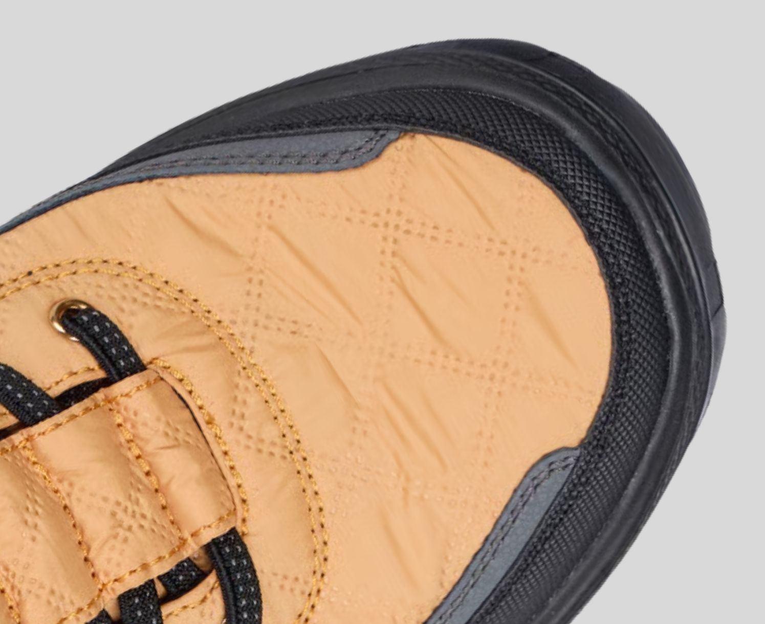 • Quilted fabric, synthetic, and leather upper with tied-off stretch laces
