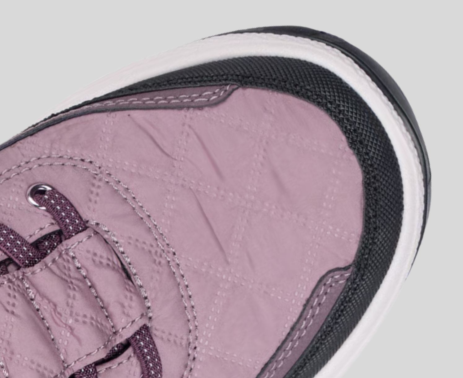 • Quilted fabric, synthetic, and leather upper with tied-off stretch laces